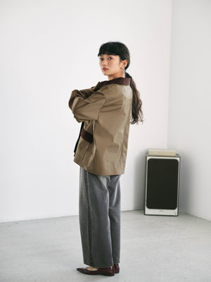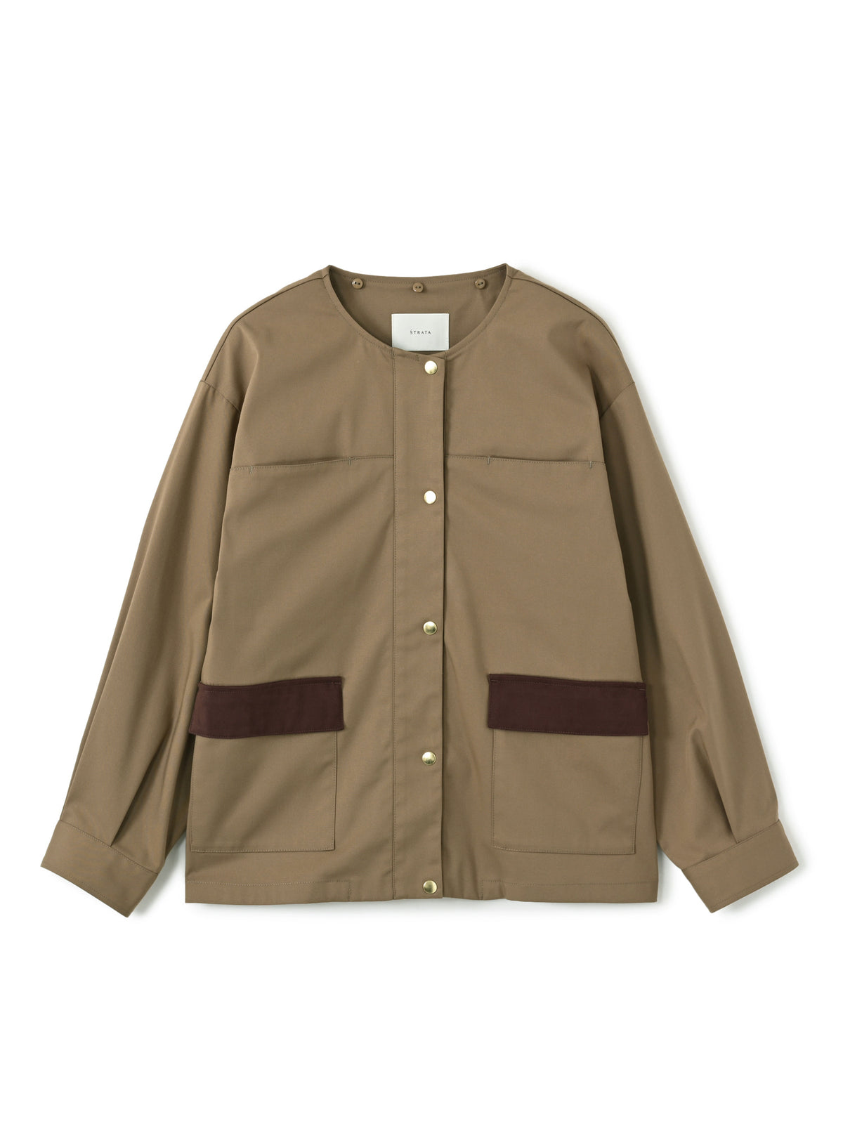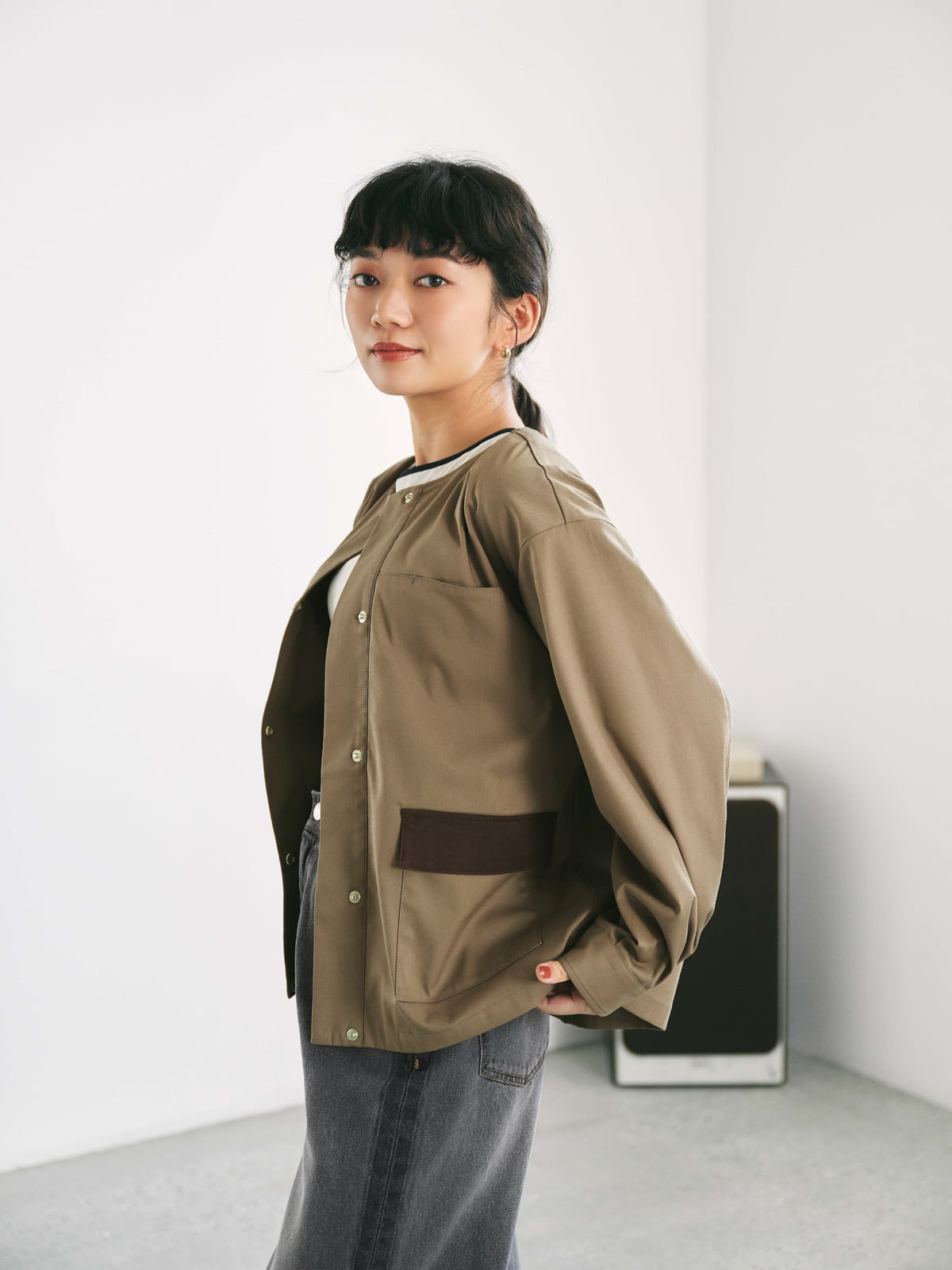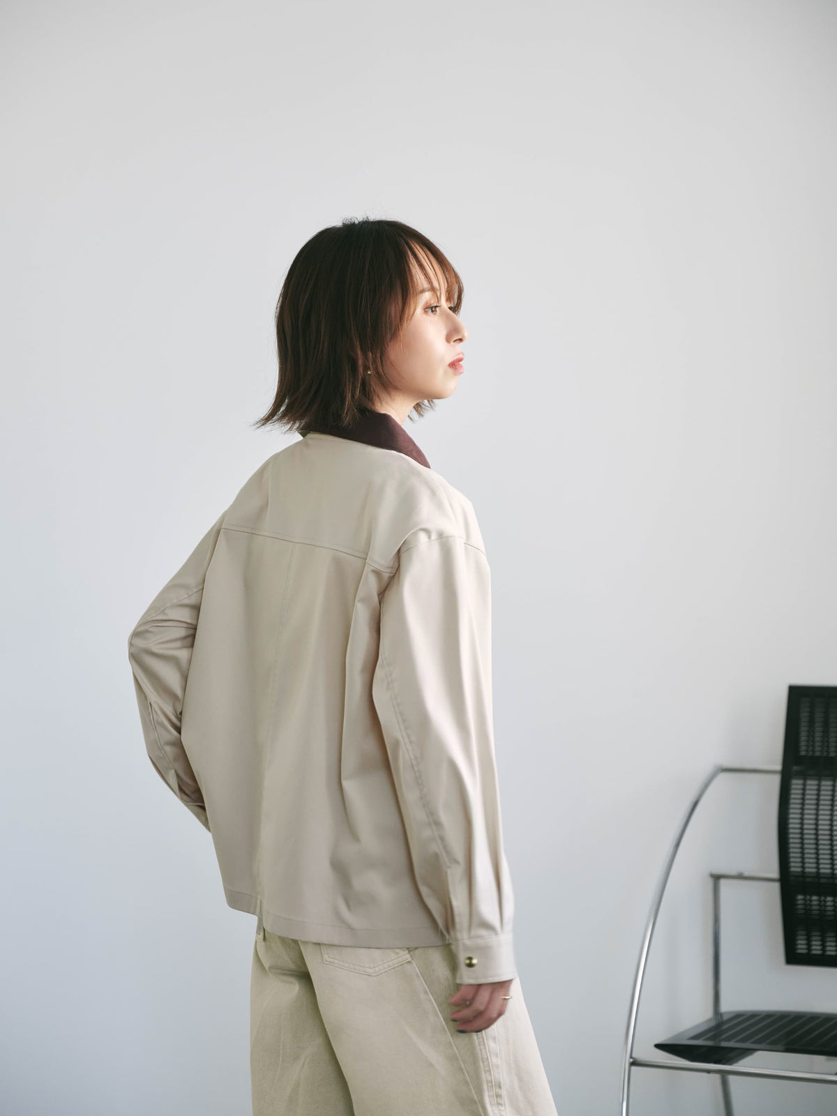 ポリエステルとレーヨンのツイル素材。程よい肉感とハリ感がありながらしなやかな風合いでシャツ感覚で羽織れます。