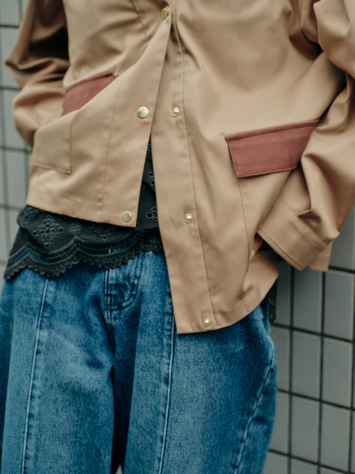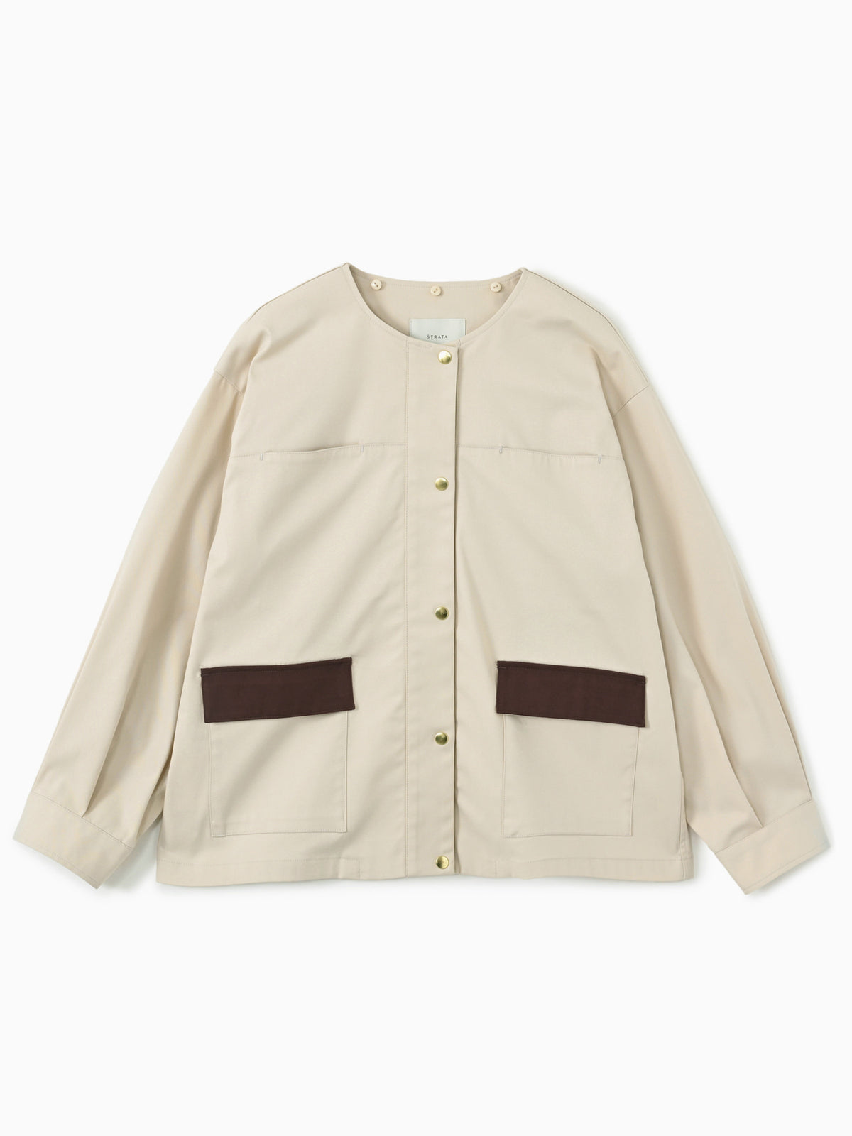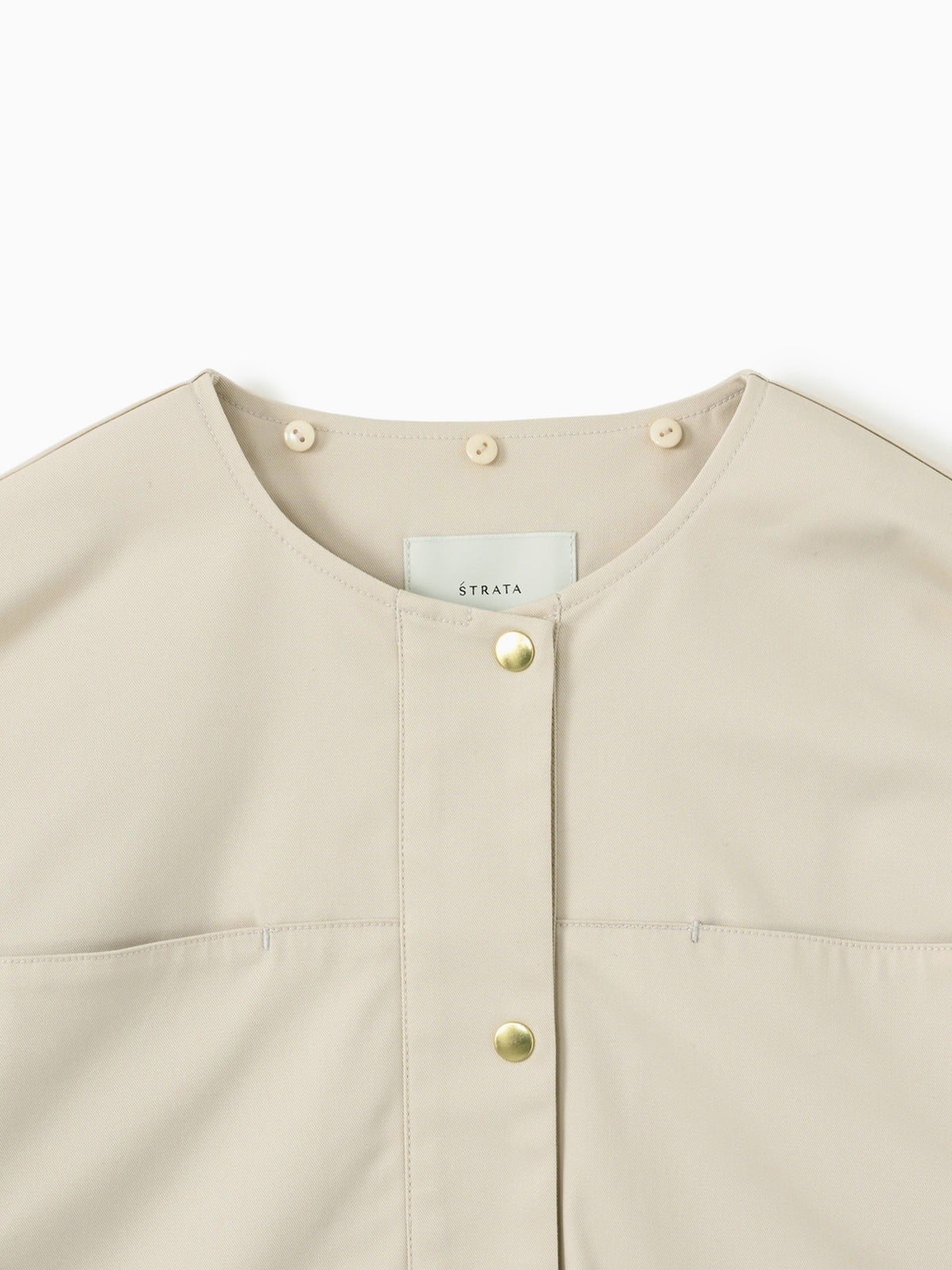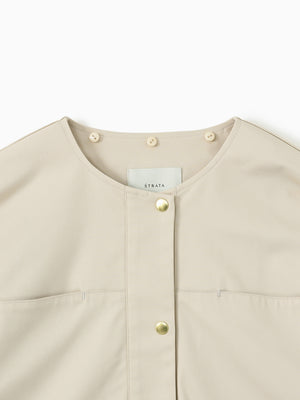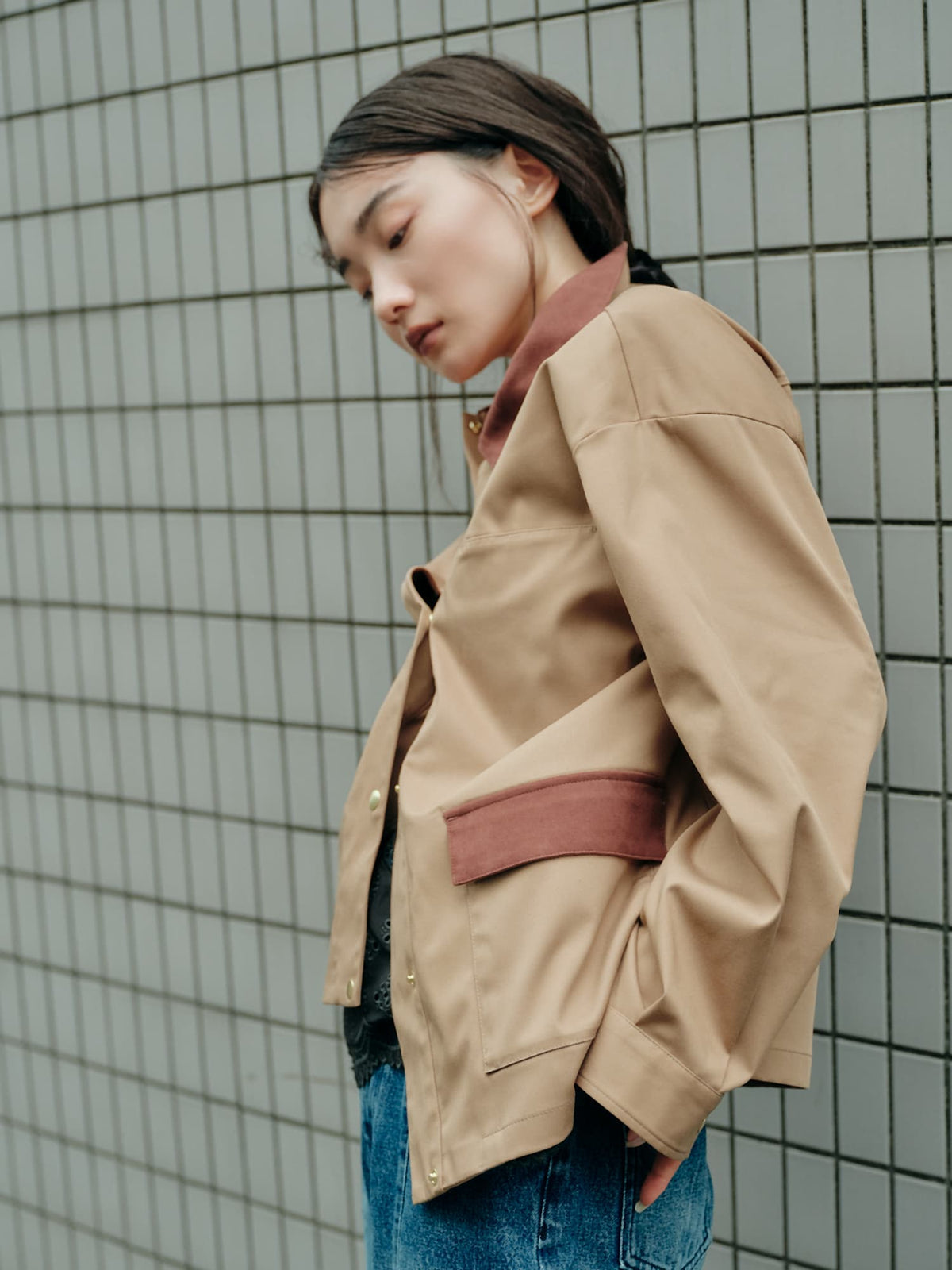 ポリエステルとレーヨンのツイル素材。程よい肉感とハリ感がありながらしなやかな風合いでシャツ感覚で羽織れます。