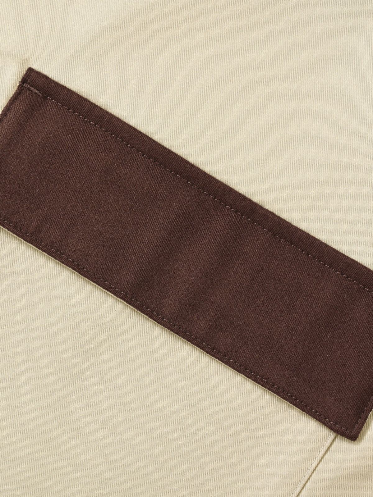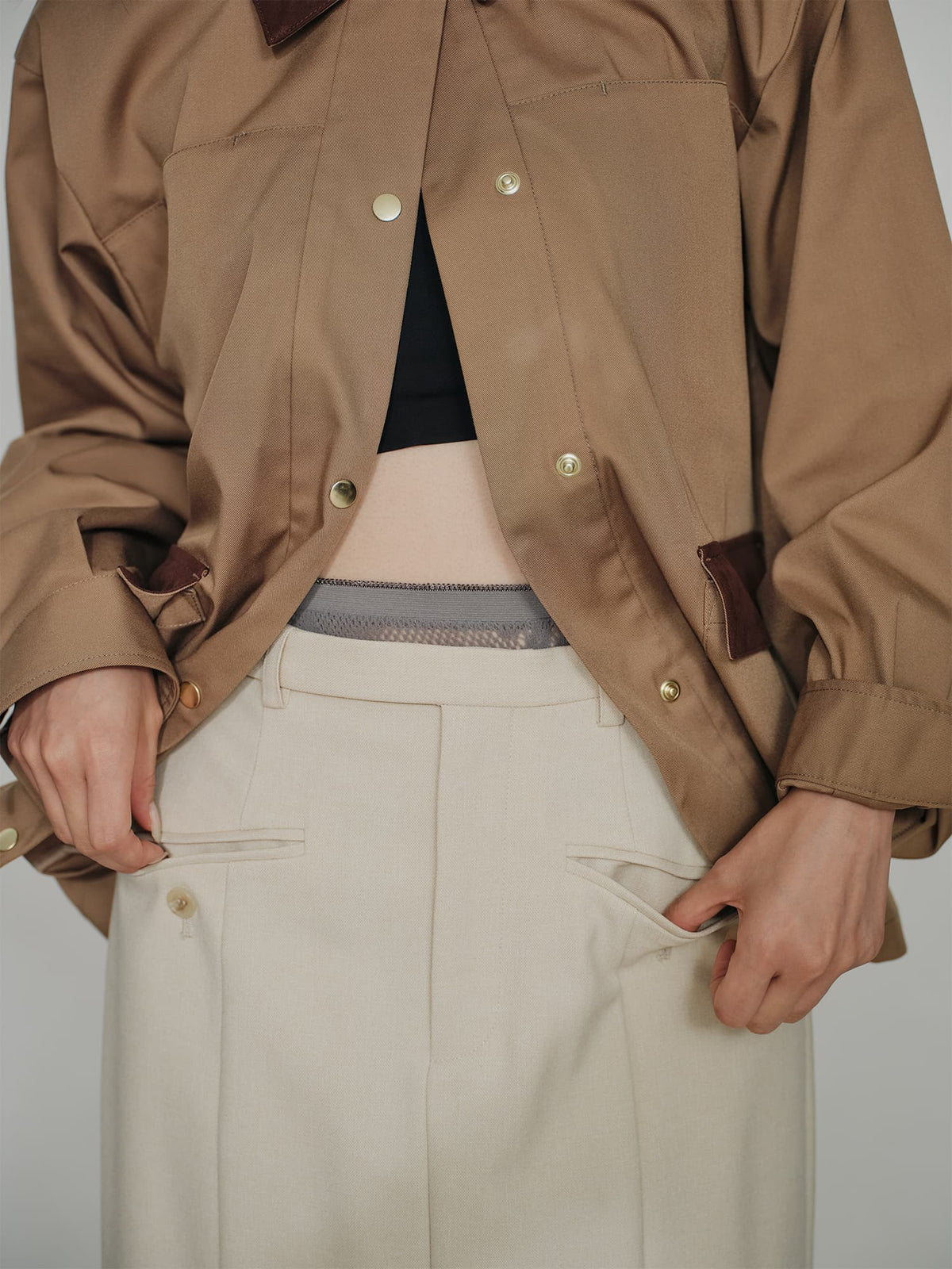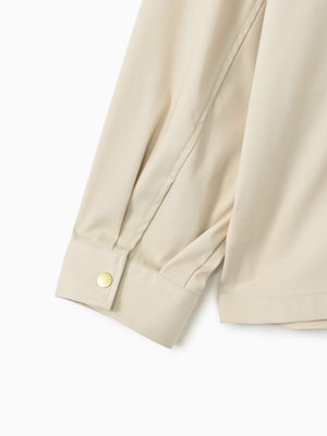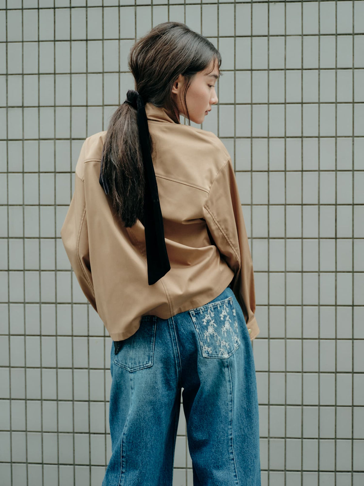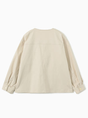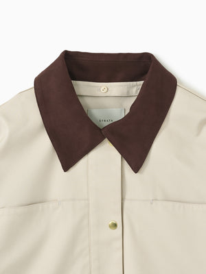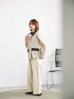 ポリエステルとレーヨンのツイル素材。程よい肉感とハリ感がありながらしなやかな風合いでシャツ感覚で羽織れます。