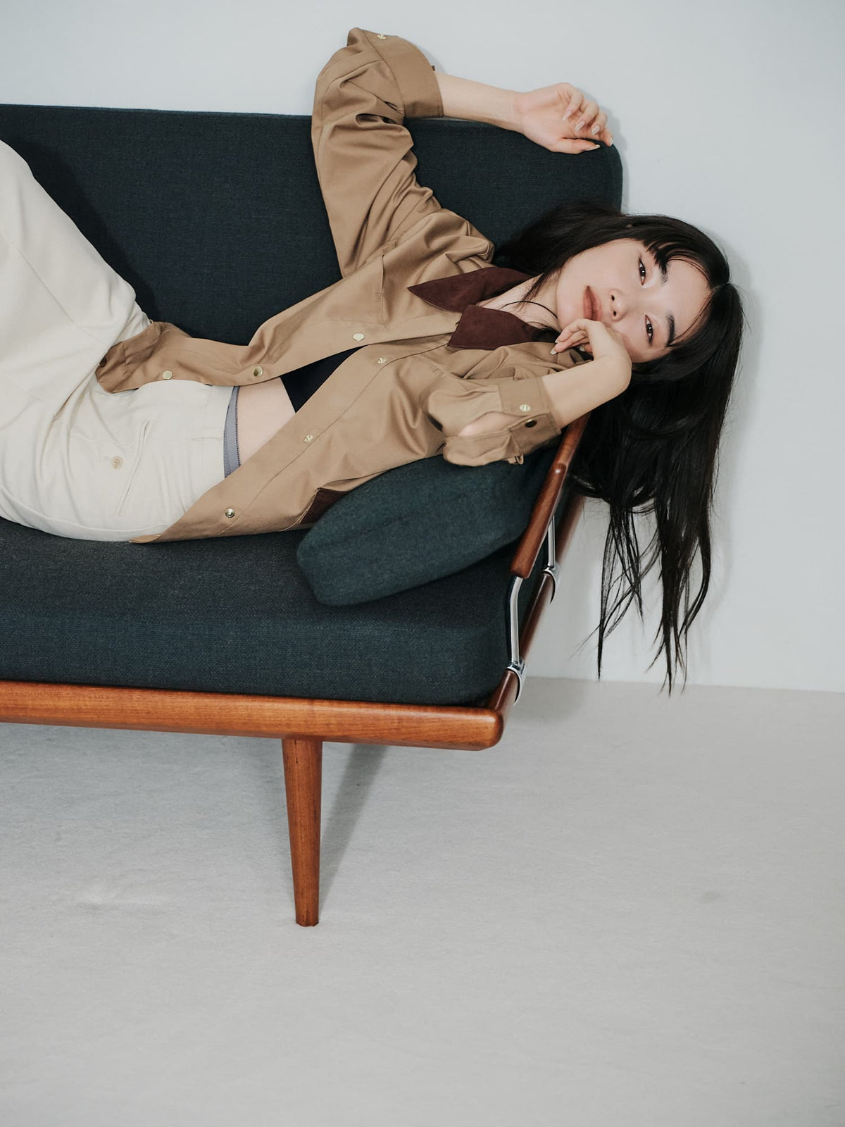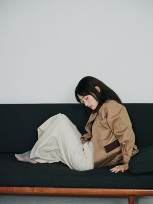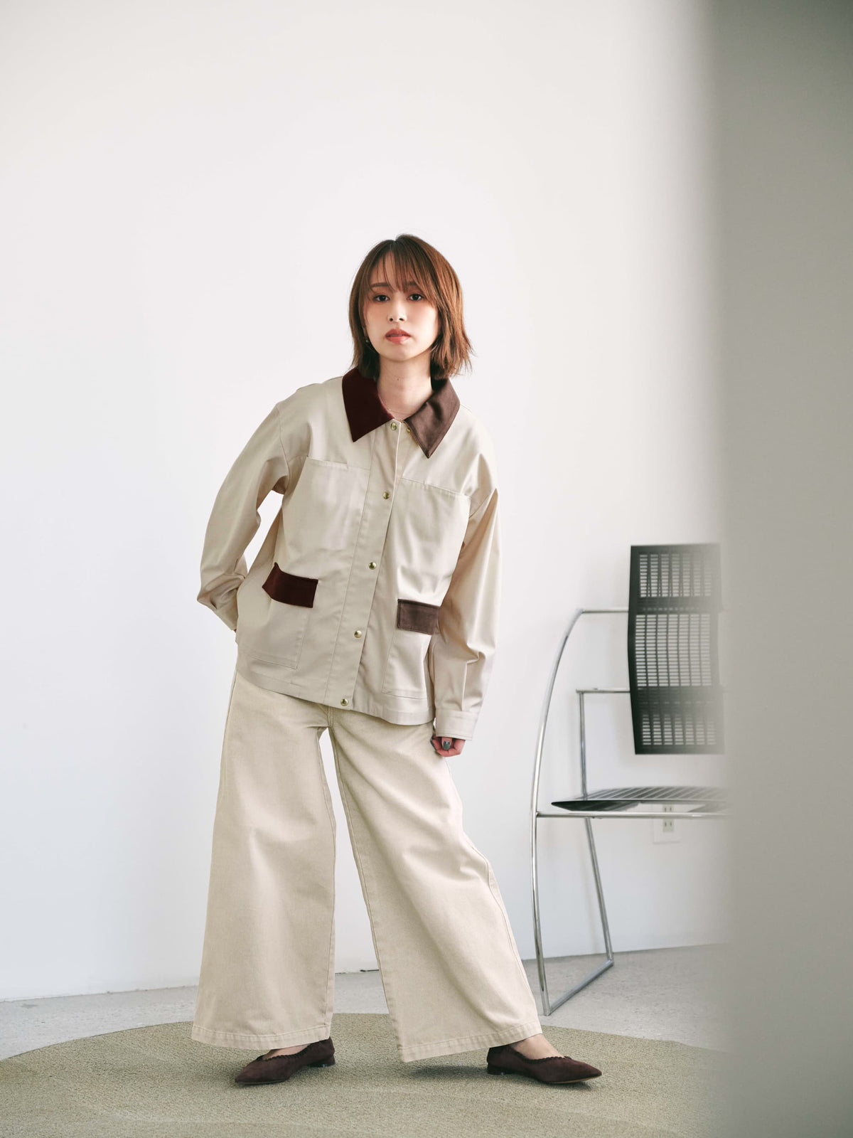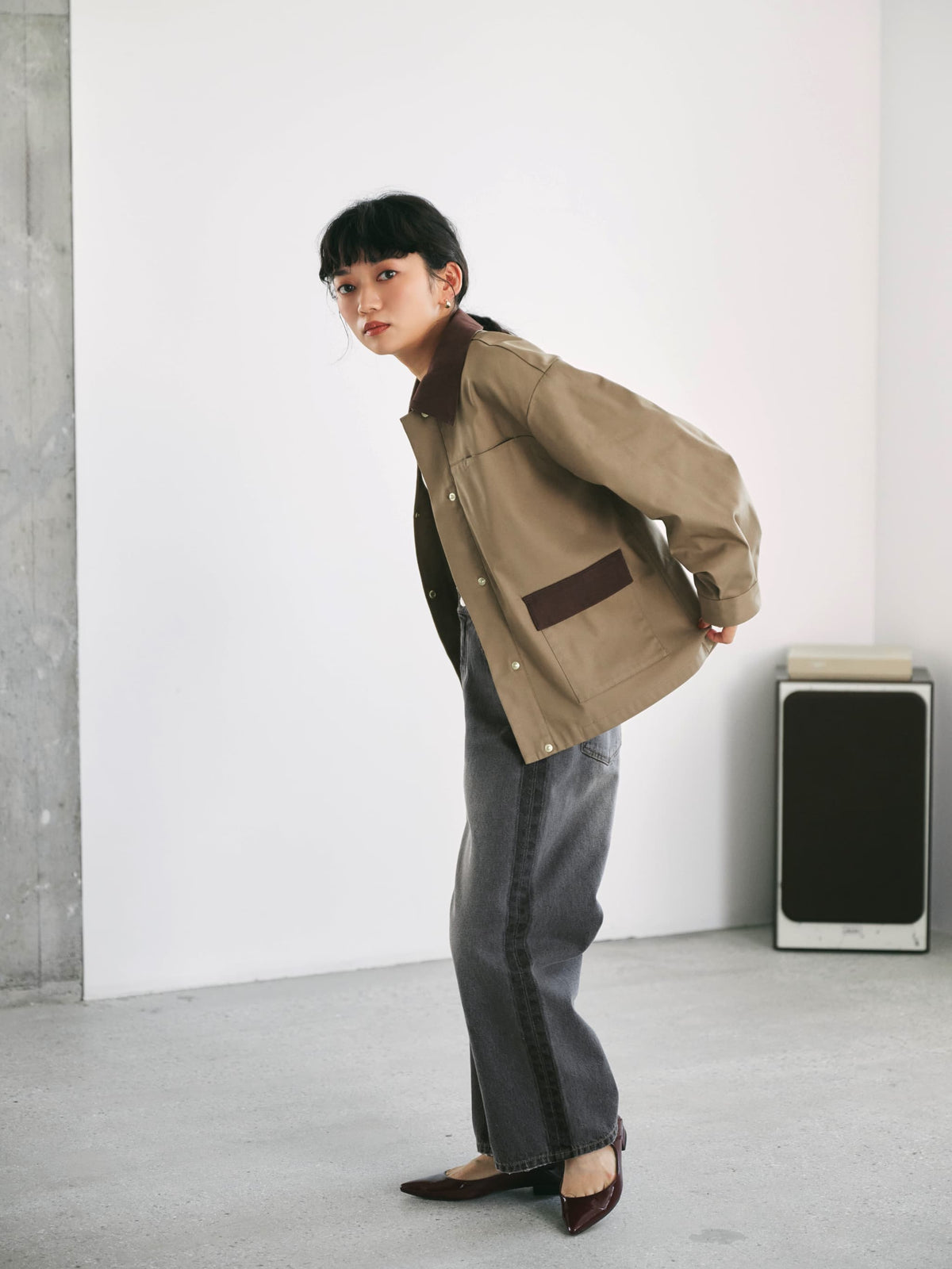 適度にゆとりのあるシルエットで、小柄な方でもばさっと羽織るだけで着こなしが決まるサイズ感。襟は取り外し可能なので、ノーカラーでも楽しめます。大きめのフラップポケットや金ボタンが効いているデザイン。