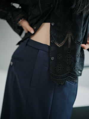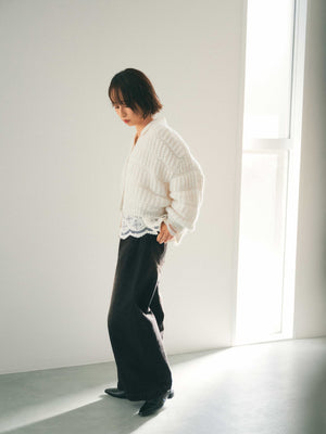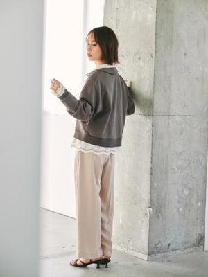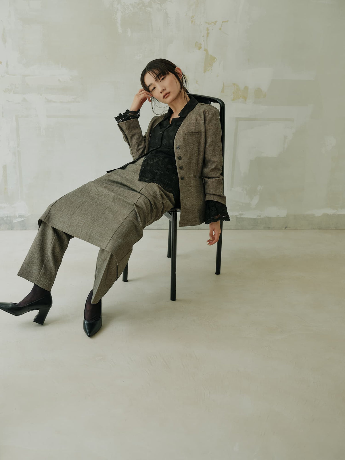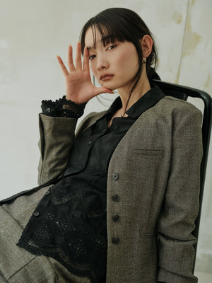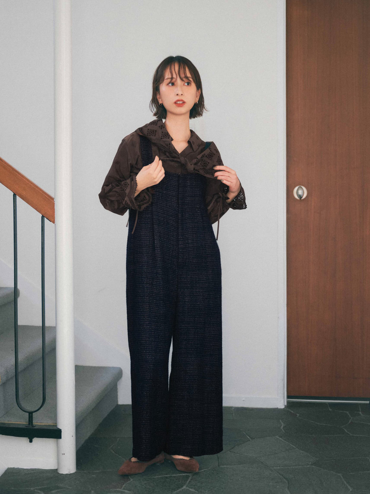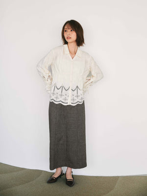 シャツカラーで甘すぎない印象ながらもVネックで女性らしい抜け感をプラスし、クラフト感のある袖口と裾のスカラップ部分がアクセントになった、他にはないSTRATAだけの特別なアイテムです。