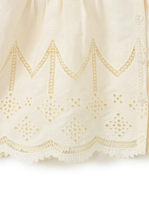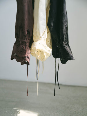 適度な肉感のあるデシン素材に、1からオリジナルの図案を作成し総刺繍を施したシリーズ。スカラップ部分には抜け感が出るように図案のサイズを調整し、小柄さんでも着用しやすく1枚で着映えするアイテムに。