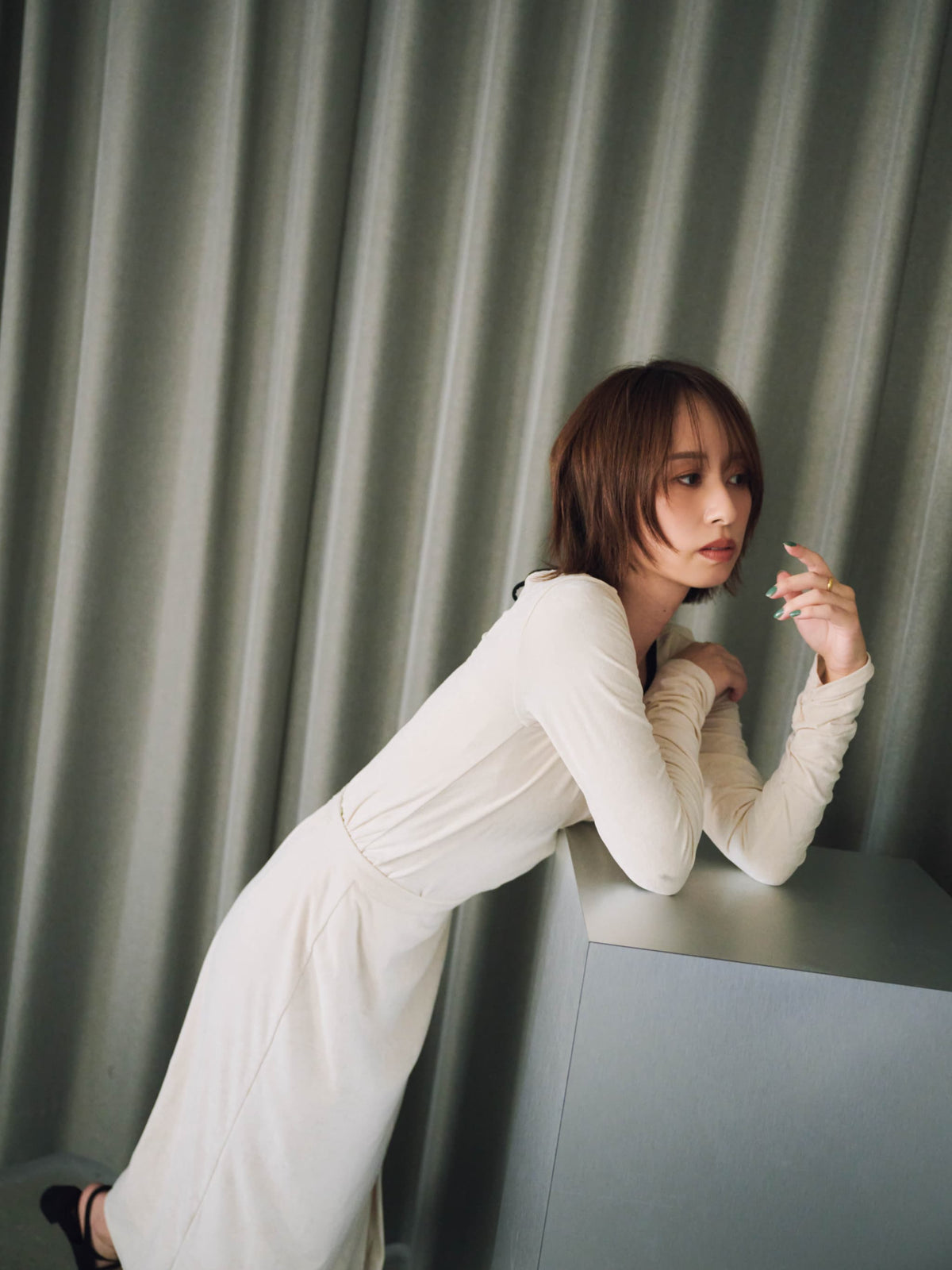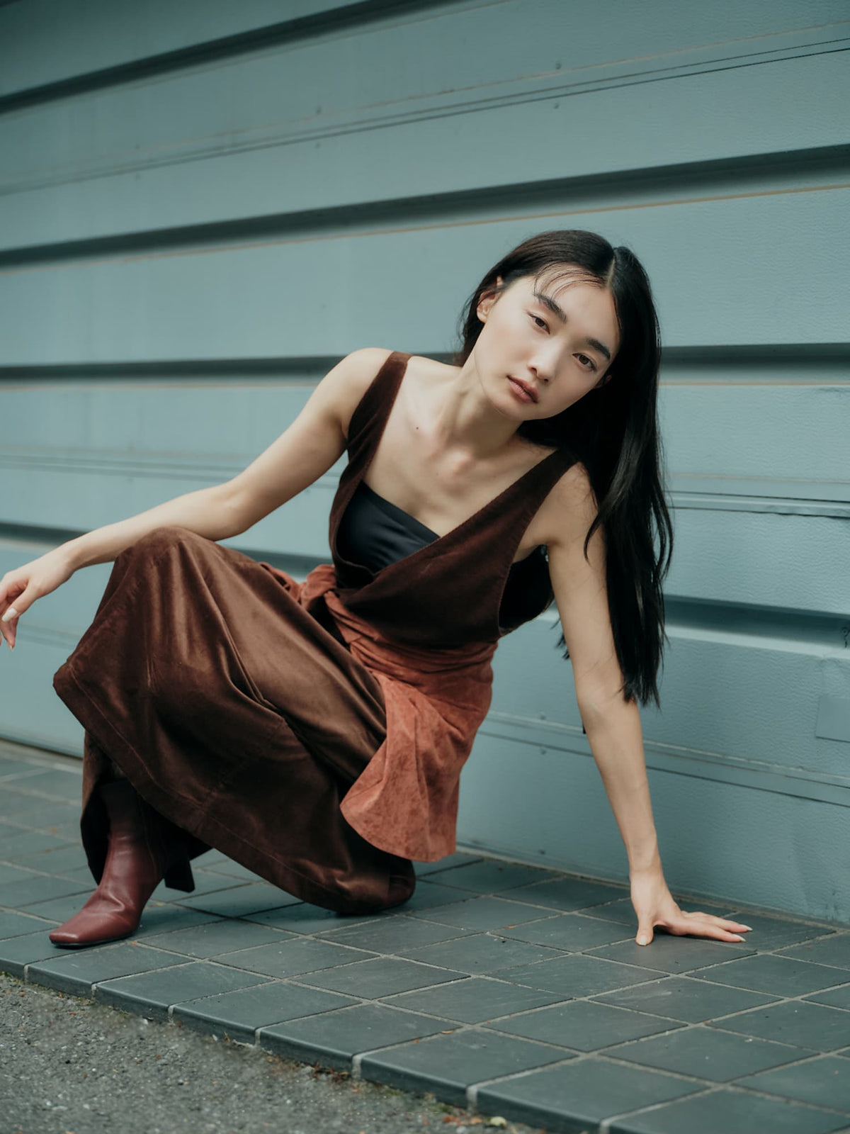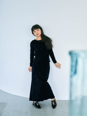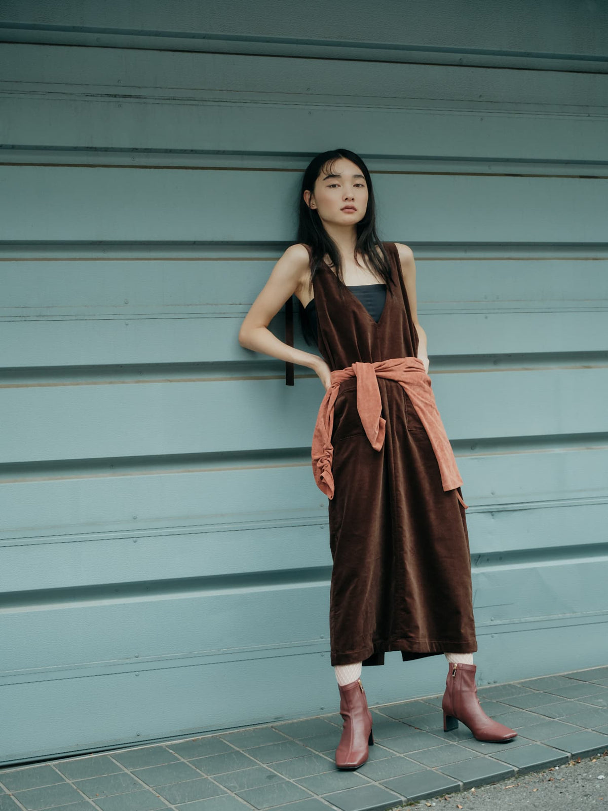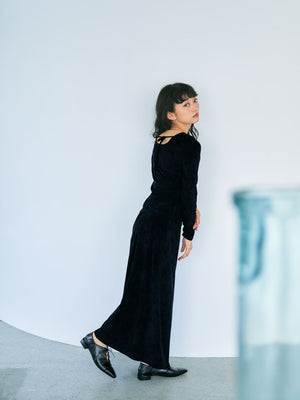 ベロアの程よい光沢感、小柄な方がすっきりと着られるサイズ感と背中の開き具合、ストレッチが効いた柔らかな着心地の良い素材など細かいこだわりが詰まった1枚。