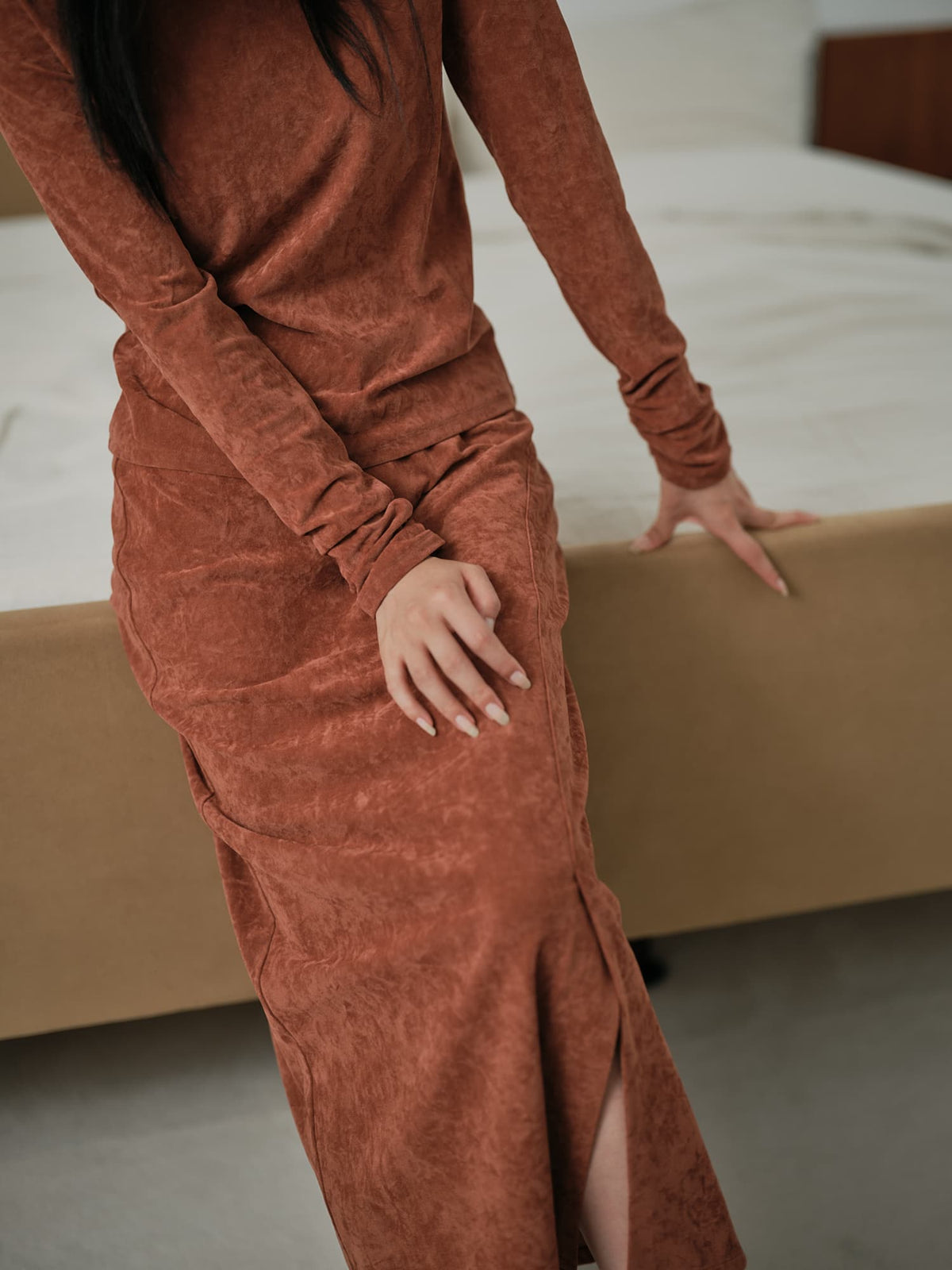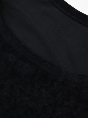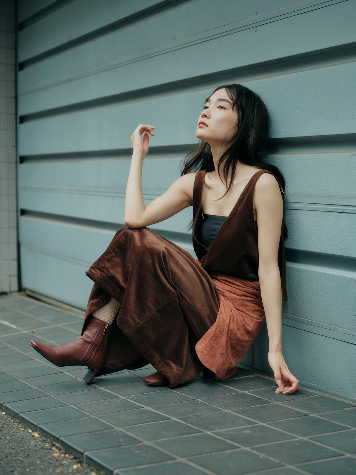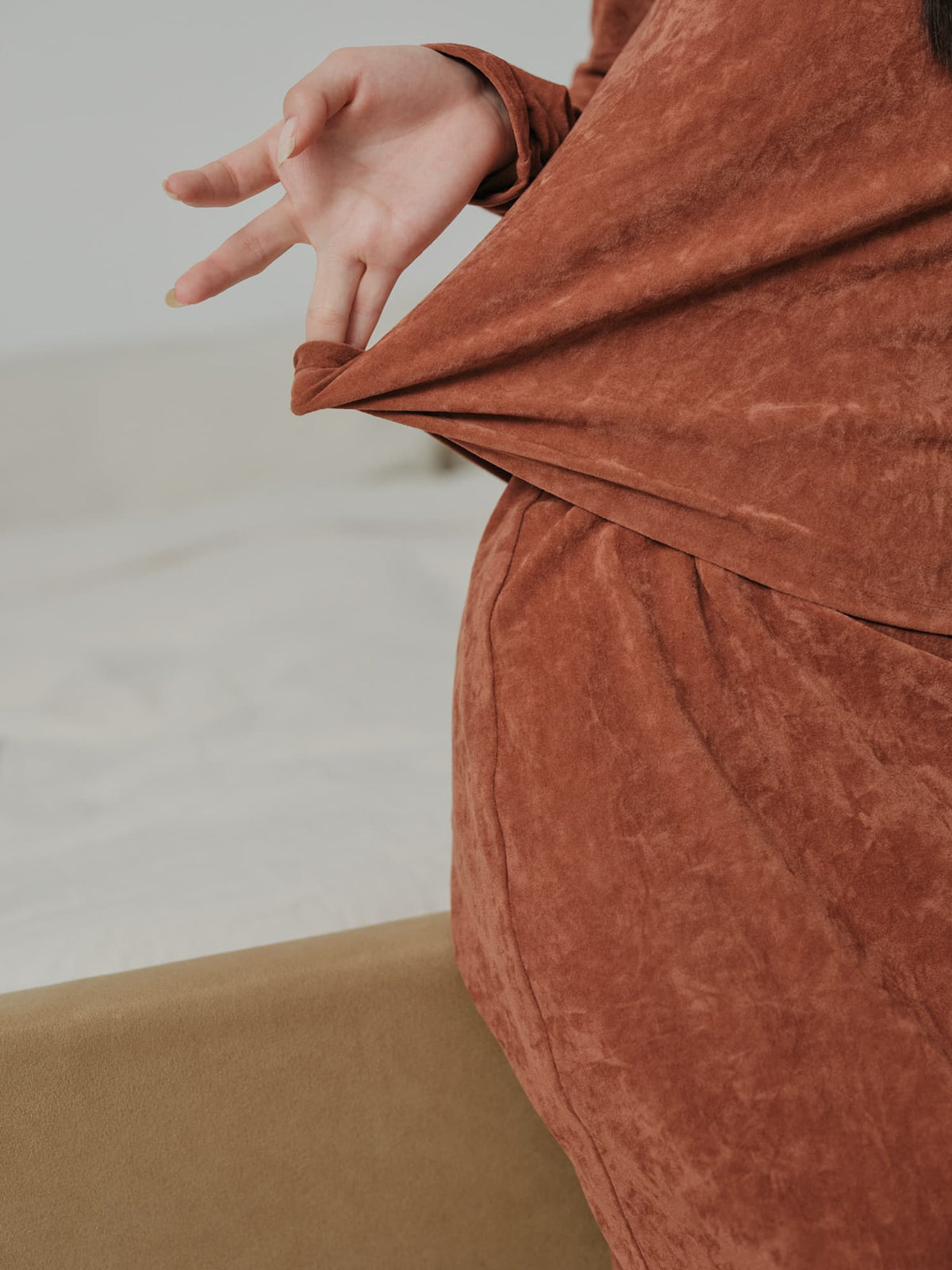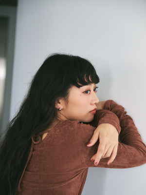 ベロアの程よい光沢感、小柄な方がすっきりと着られるサイズ感と背中の開き具合、ストレッチが効いた柔らかな着心地の良い素材など細かいこだわりが詰まった1枚。