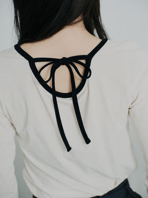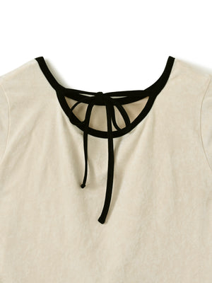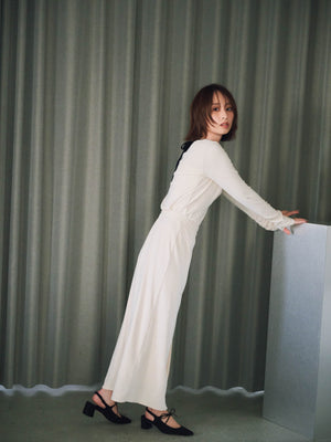 襟ぐりも開きすぎないボートネックで顔まわりがすっきりと見え、バックスタイルも程よい開き具合とリボンのデザインが前後どちらも美しい。コンパクトなサイズ感でも着心地良く着ていただけます。