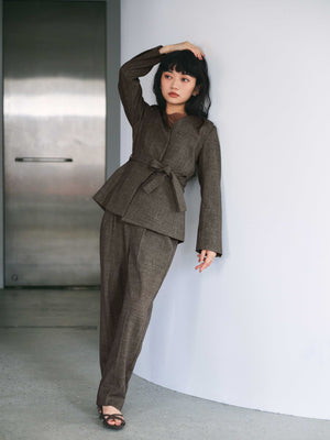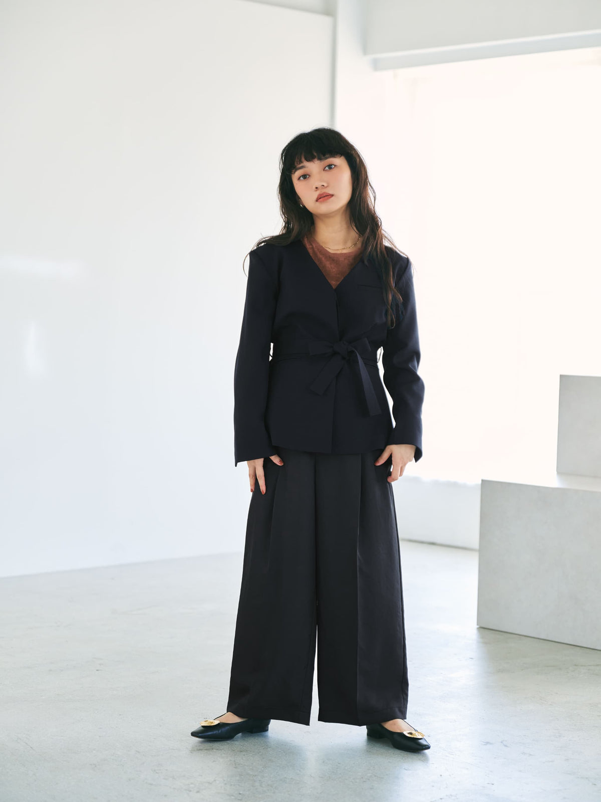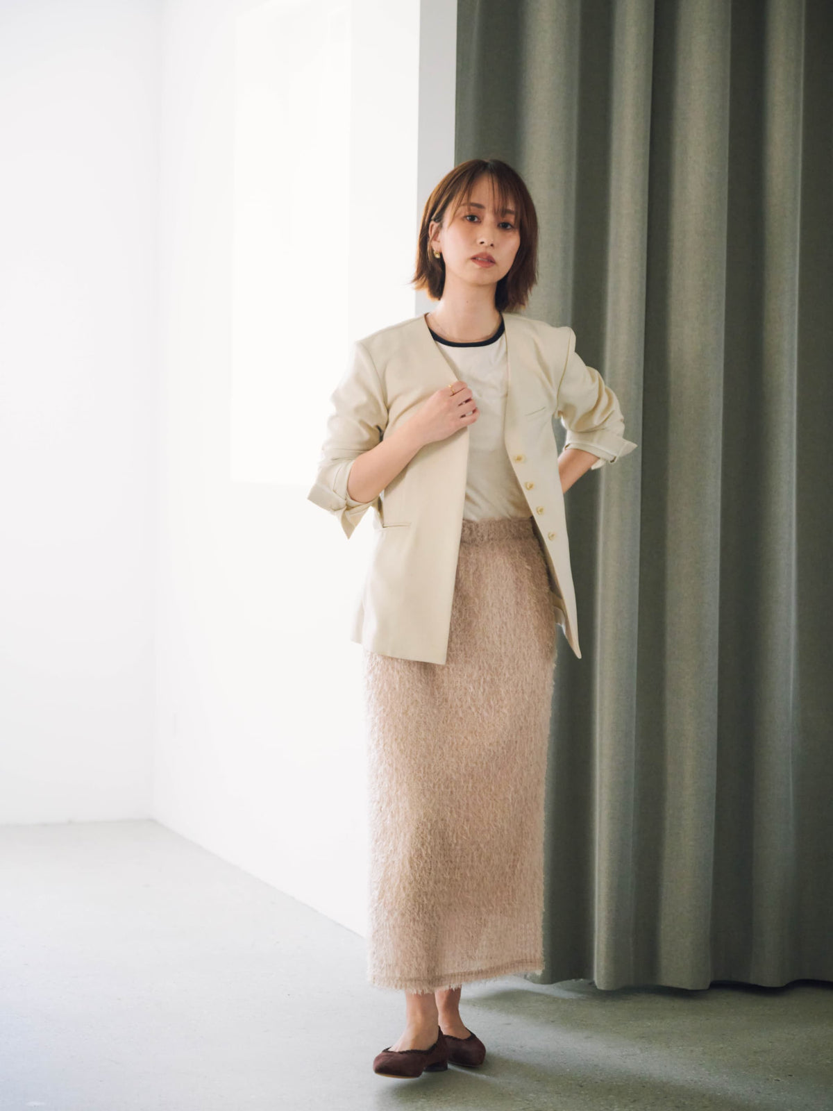 148cmでお尻がやや隠れる丈感。ほどよいフィット感ながら、上品な素材とコンパクトな襟元のおかげで上半身がすっきり見えます。くしゅくしゅっとしたお袖は手の甲が隠れる長さで、秋冬のレイヤードにもぴったりなサイズ感です。
