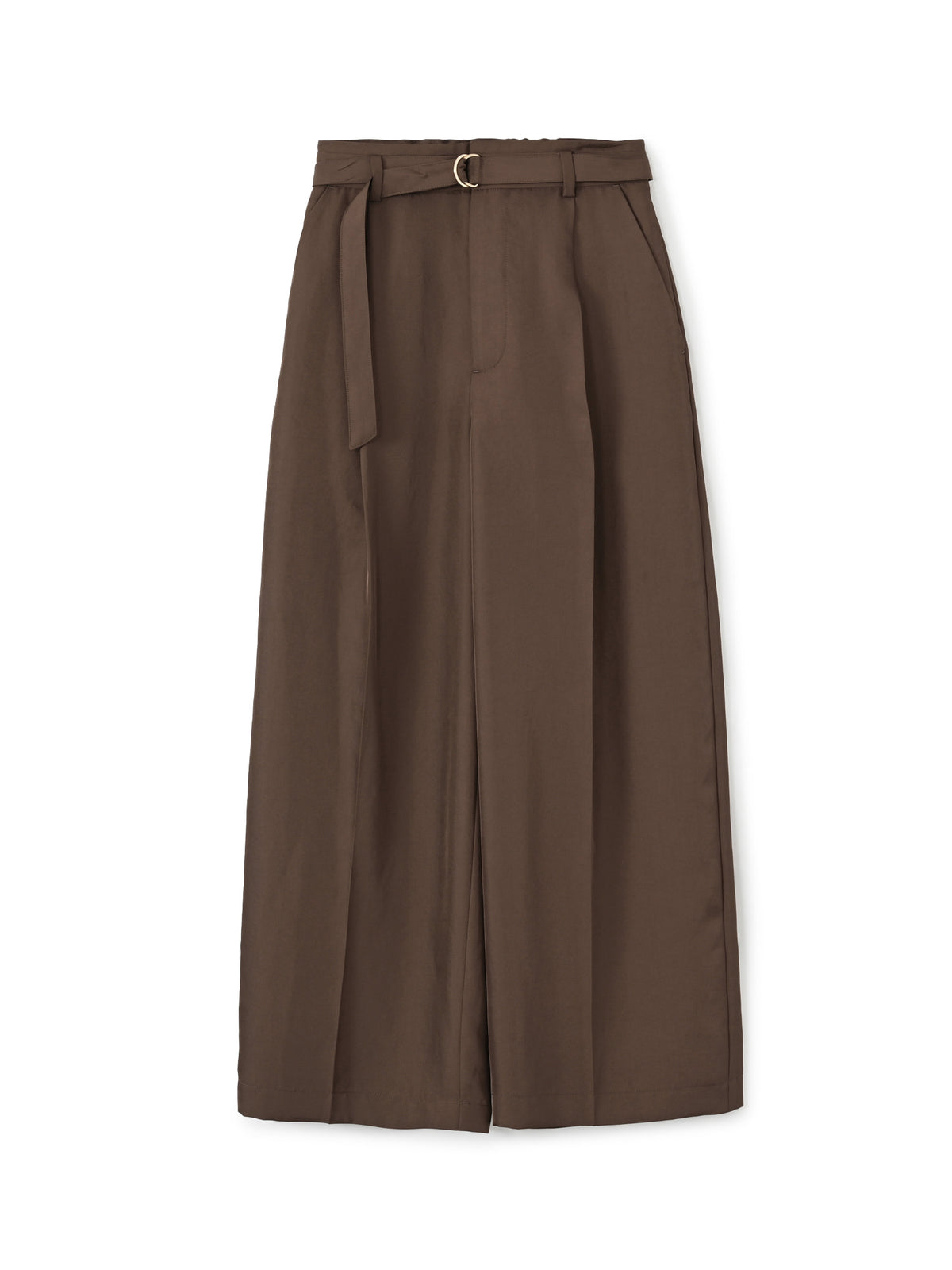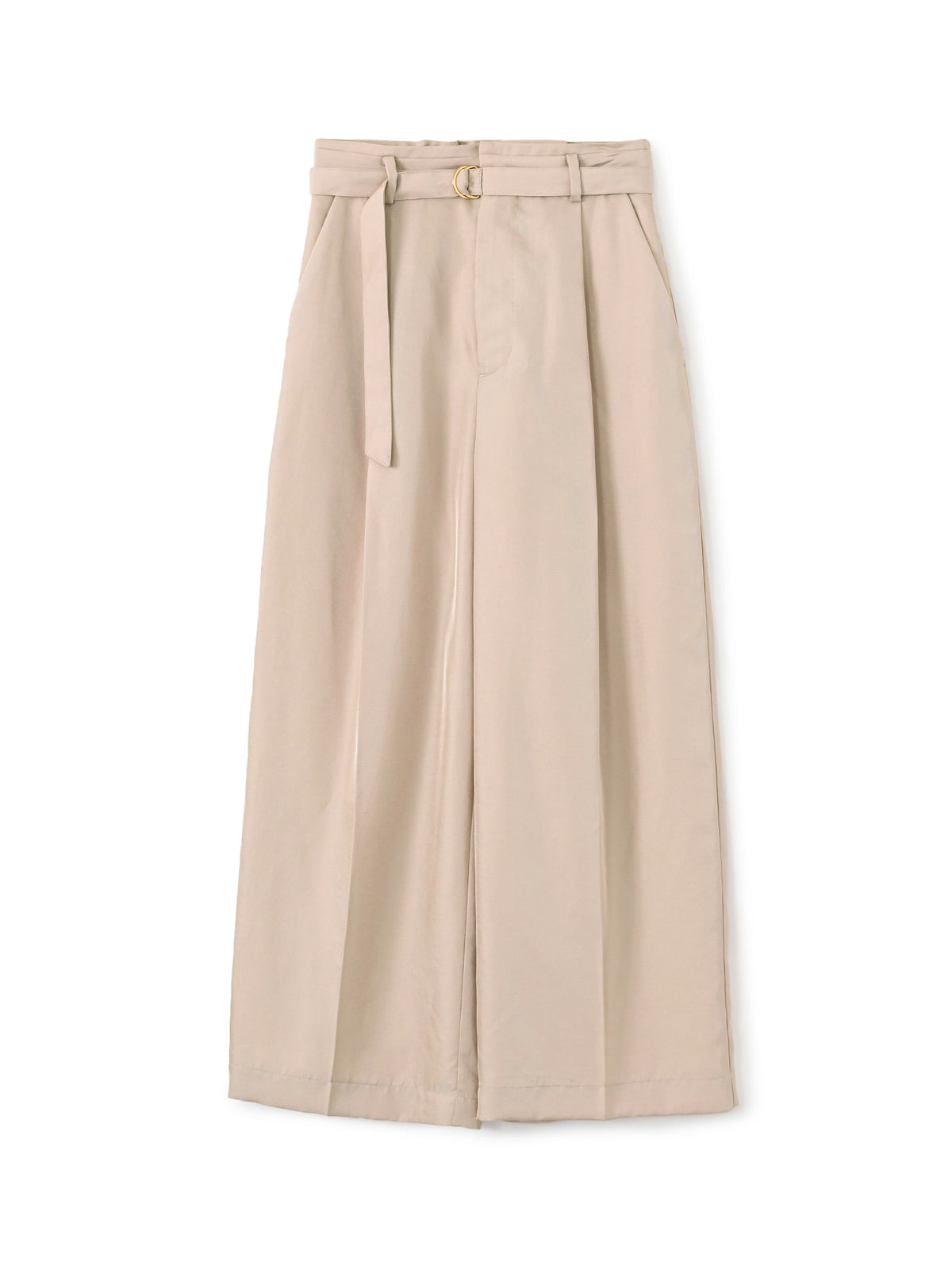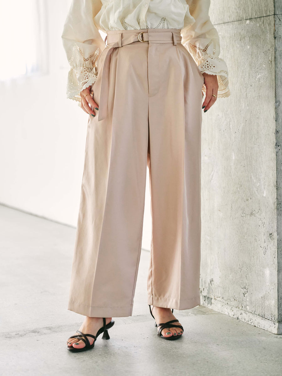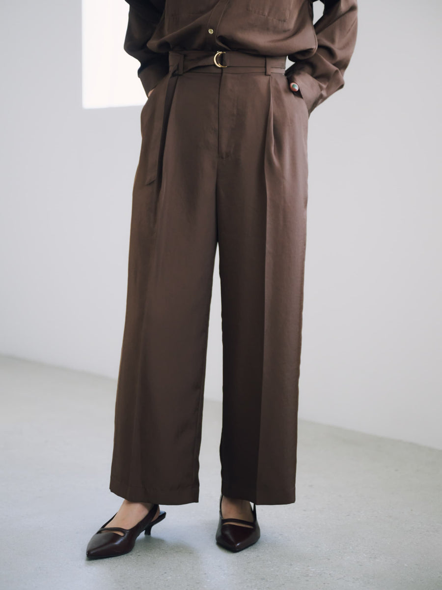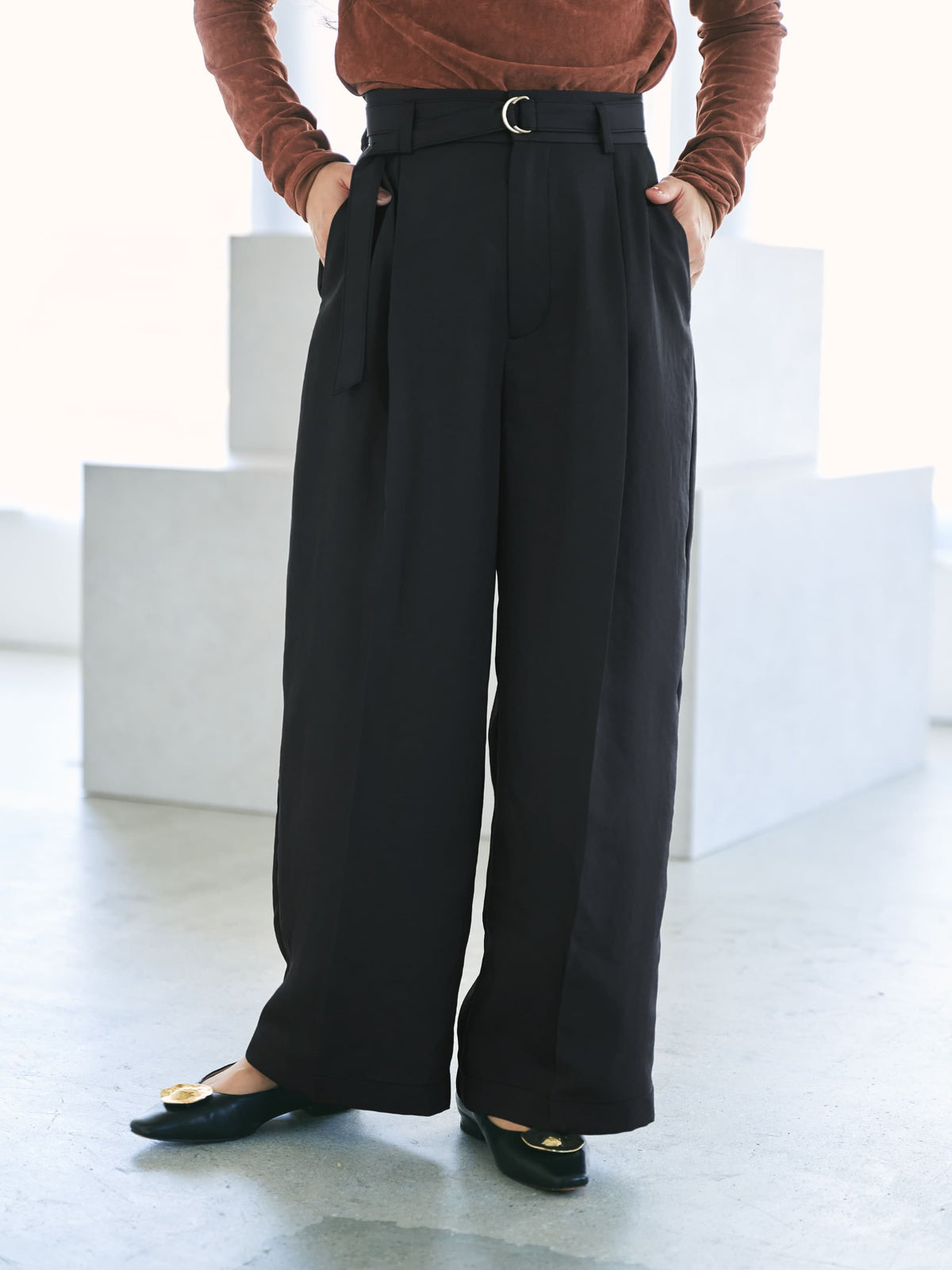 艶感と落ち感のある素材が女性らしいタックパンツ。お手持ちのベルトと合わせるのはもちろん、共布ベルト付きでウエストマークが叶いスタイルUP効果も◎