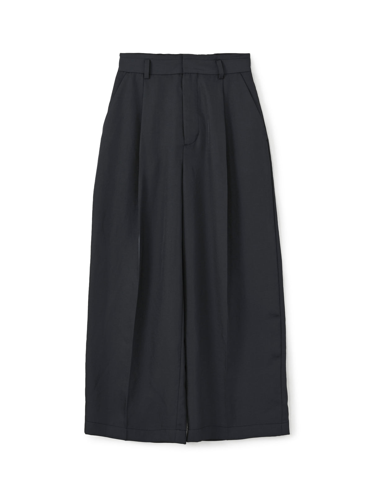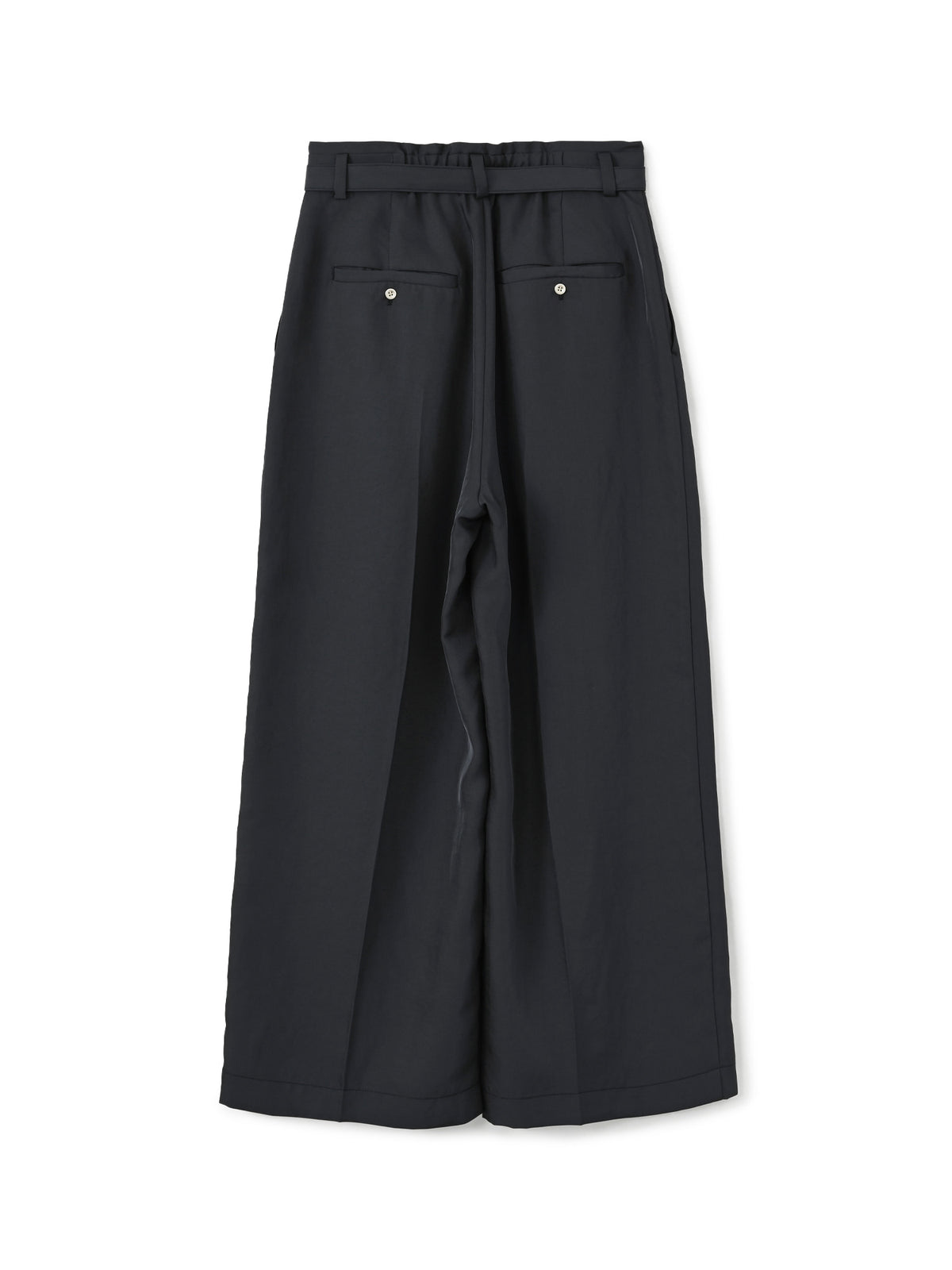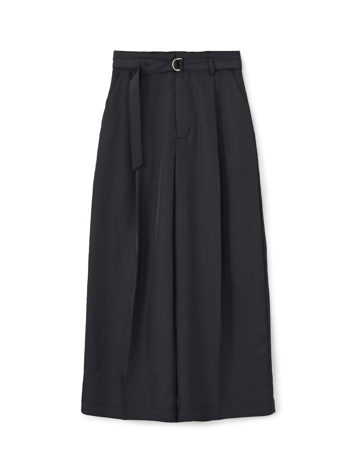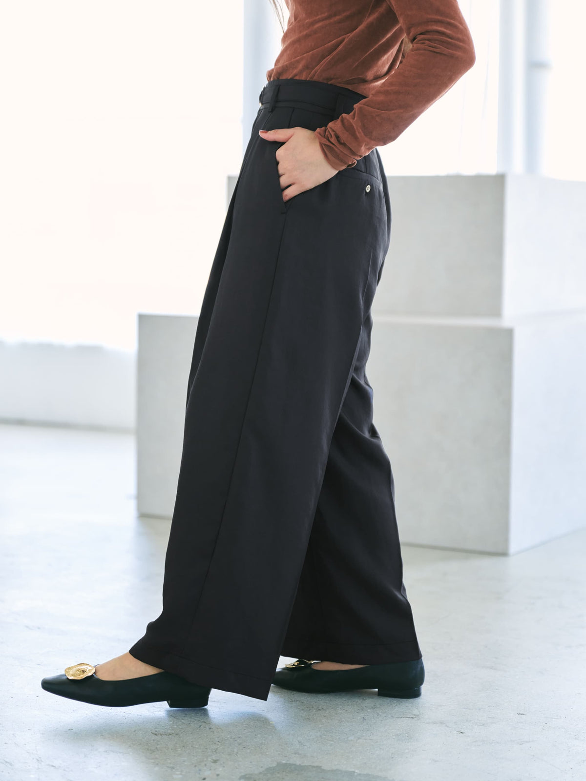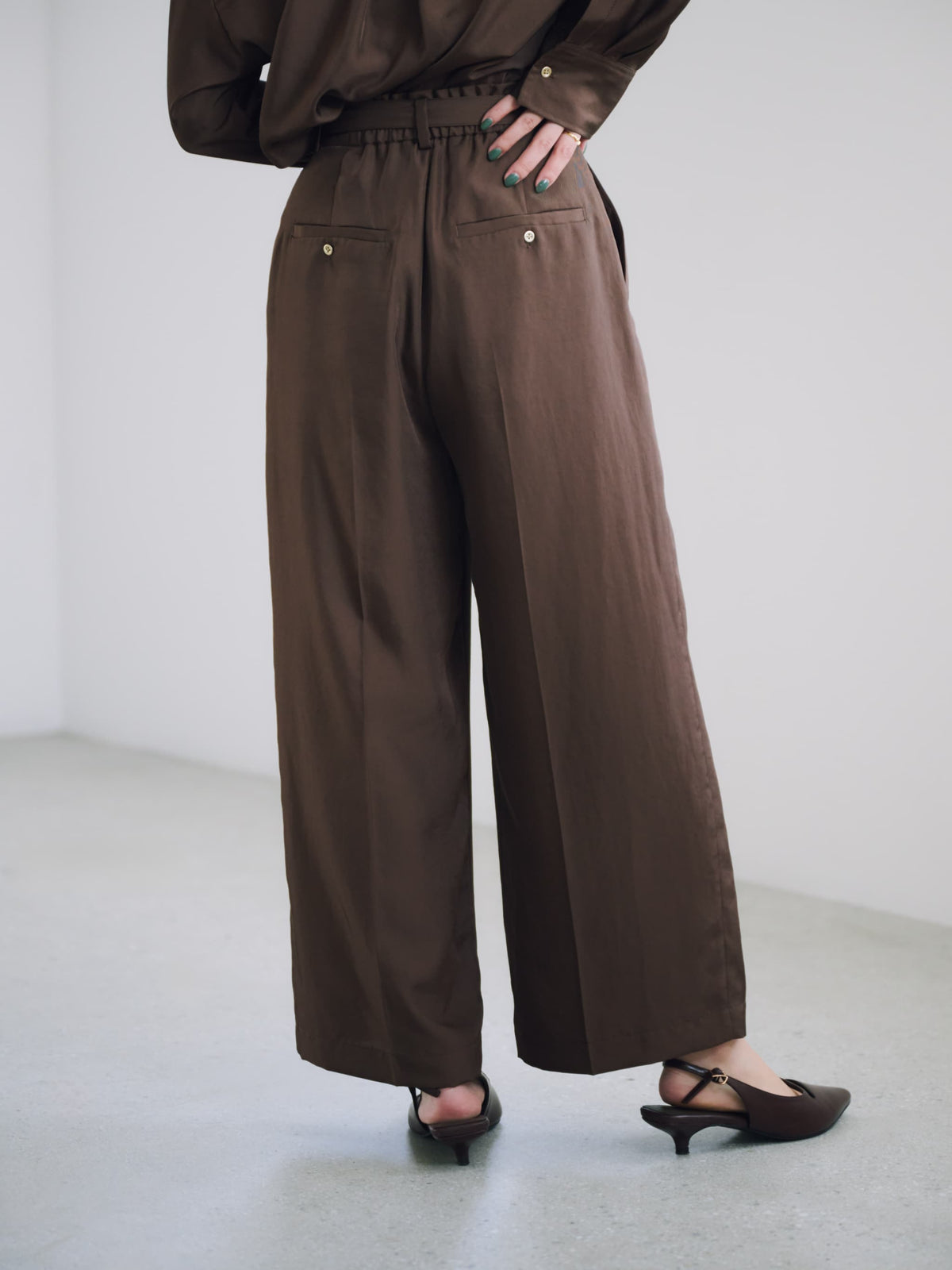 艶感と落ち感のある素材が女性らしいタックパンツ。お手持ちのベルトと合わせるのはもちろん、共布ベルト付きでウエストマークが叶いスタイルUP効果も◎