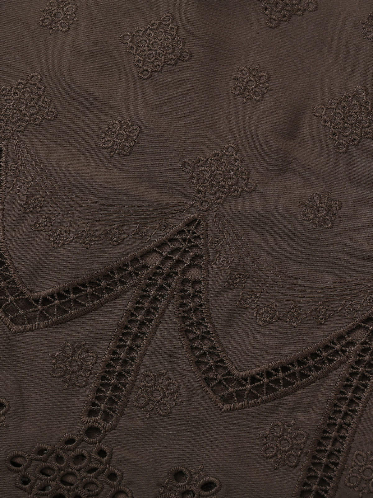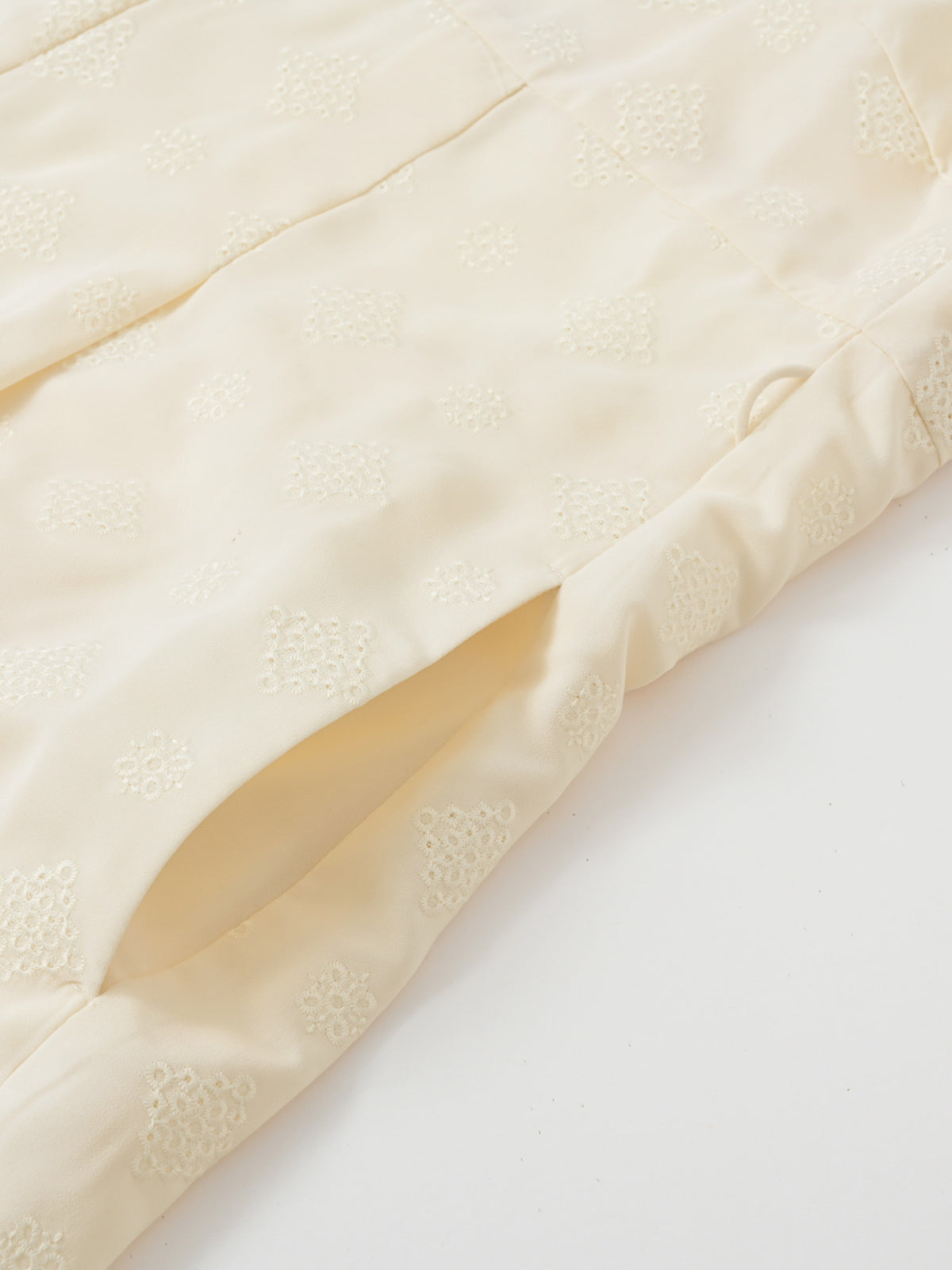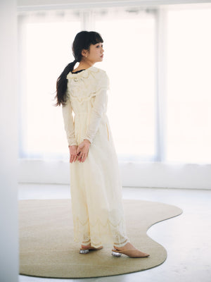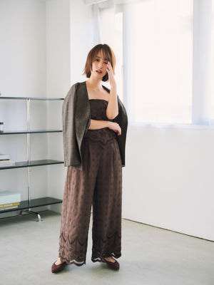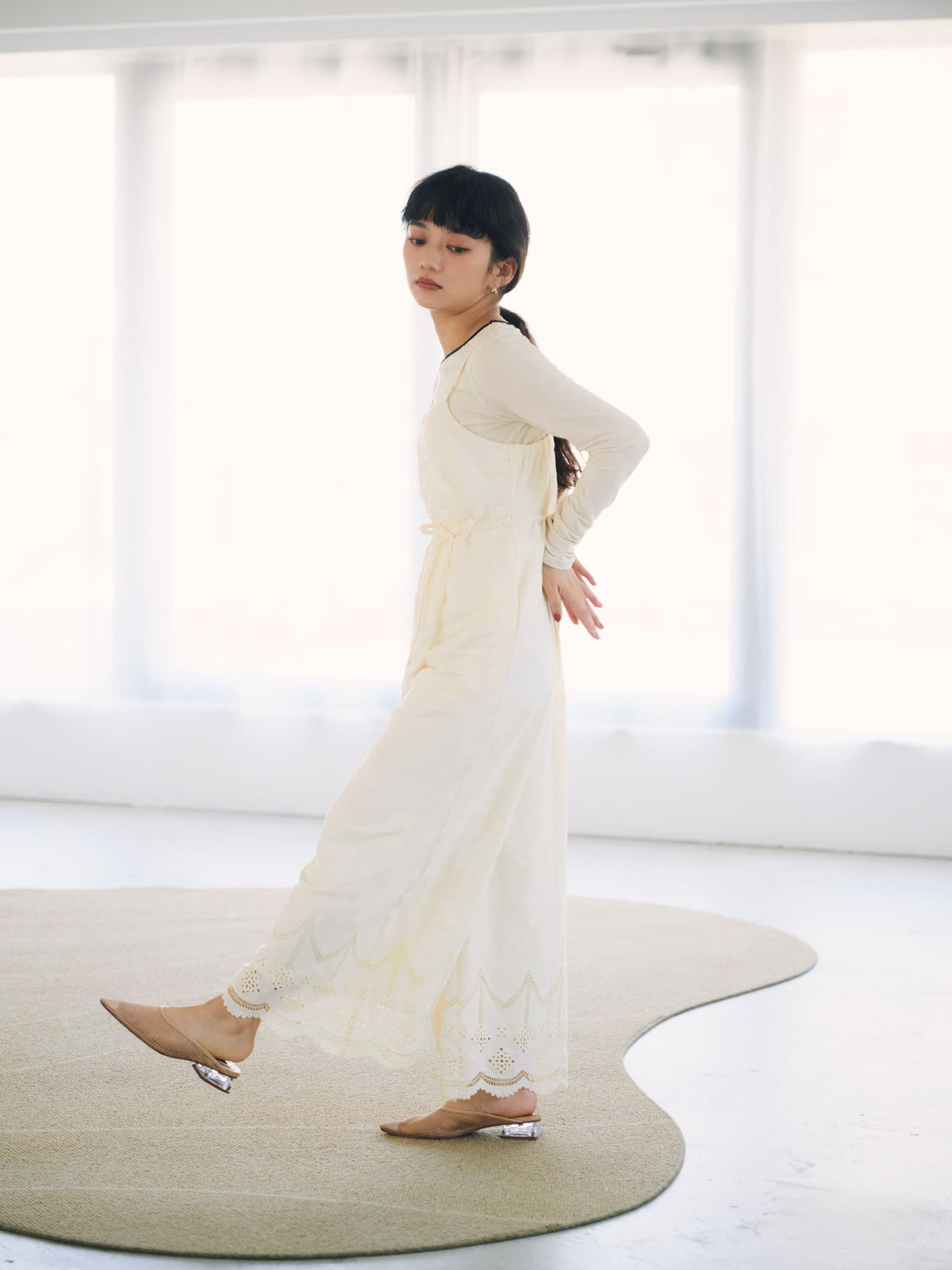 スカラップ部分には抜け感が出るように図案のサイズを調整し、小柄さんでも着用しやすく1枚で着映えするアイテムに。フェミニンさがありながらも大人も着用しやすい柄に仕上げたSTRATAだけの特別なテキスタイルです。