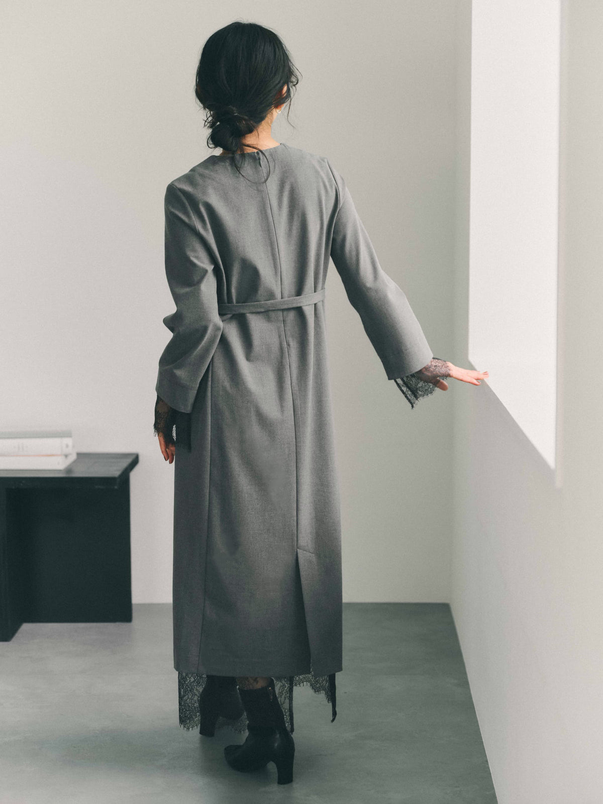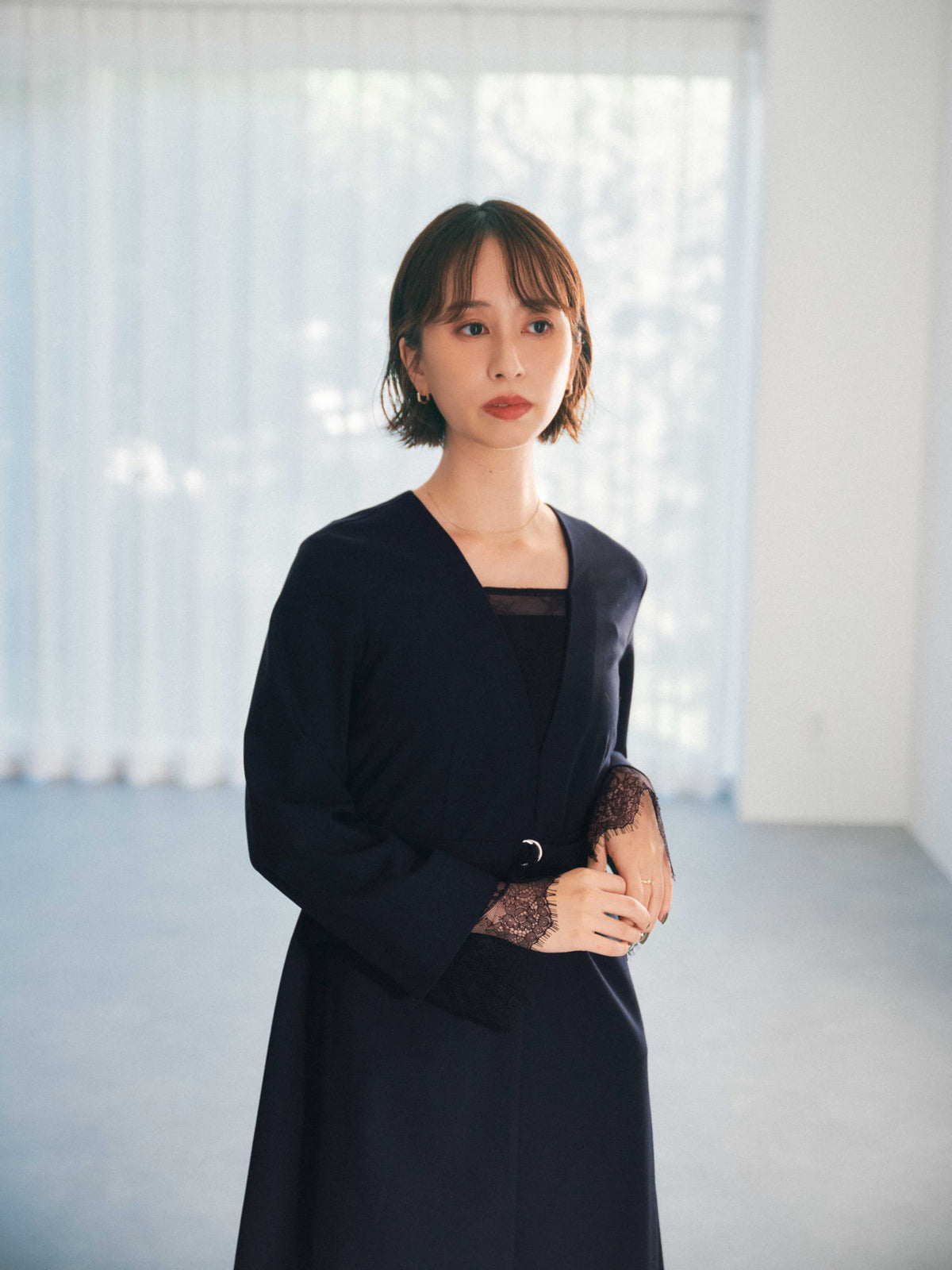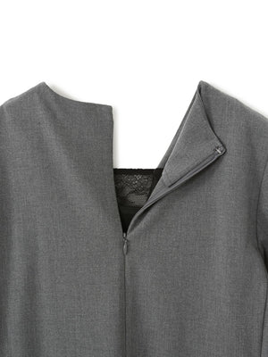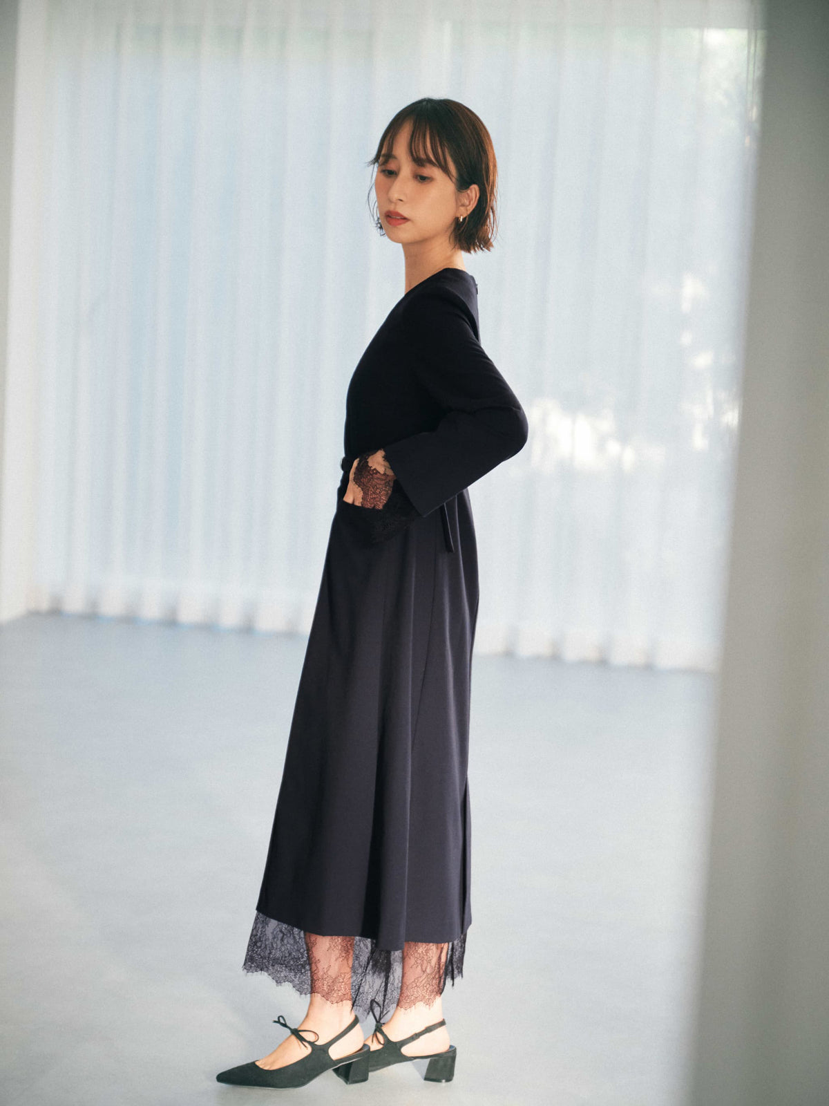 ストラップが調整できるキャミソールドレスがセットになっているので胸元のレースも透け感を気にせず着用可能です。袖口にスリットがあるので上品な印象且つ、ウエストマーク可能でスタイルUP見えも叶い、STRATAらしい大人の小柄女性に向けた1枚。