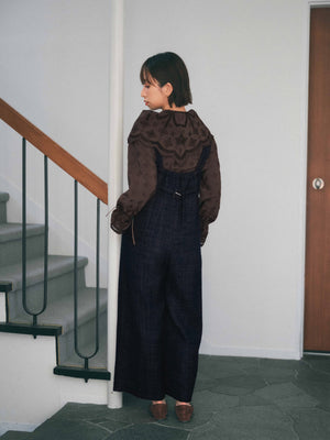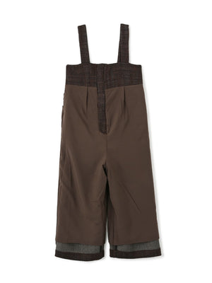 胸元の切り替えを高めに設定し、パンツもゆとりのあるシルエットにしつつワイドすぎないので小柄さんもバランス良く着られるよう仕上げました。背中はゴム仕様にし動きやすく、肩紐もボタンホールで調節可能です。